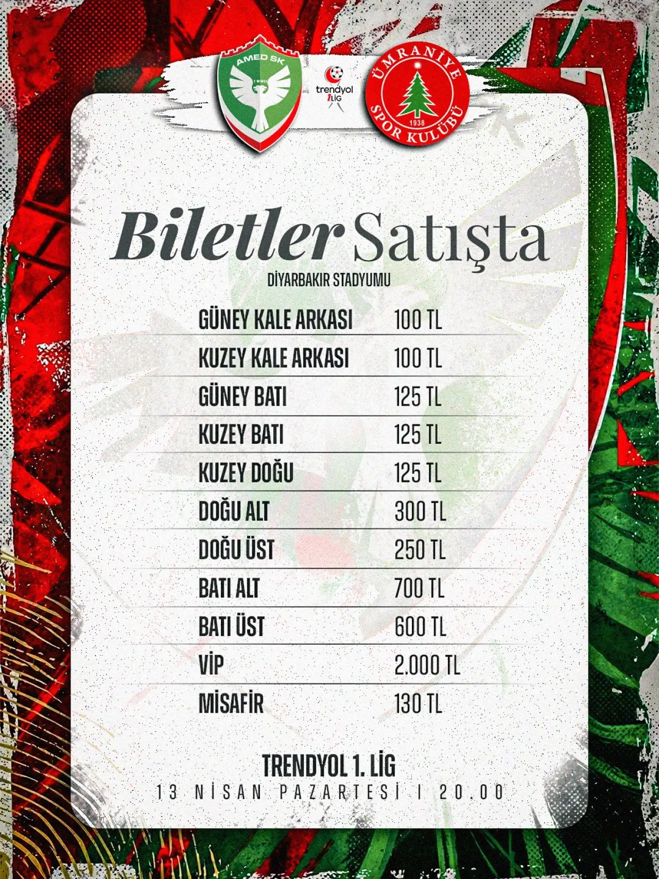 Amedspor ile Ümraniyespor arasında oynanacak mücadele, 13 Nisan Pazartesi günü saat 20.00’de Diyarbakır Stadyumu’nda başlayacak.