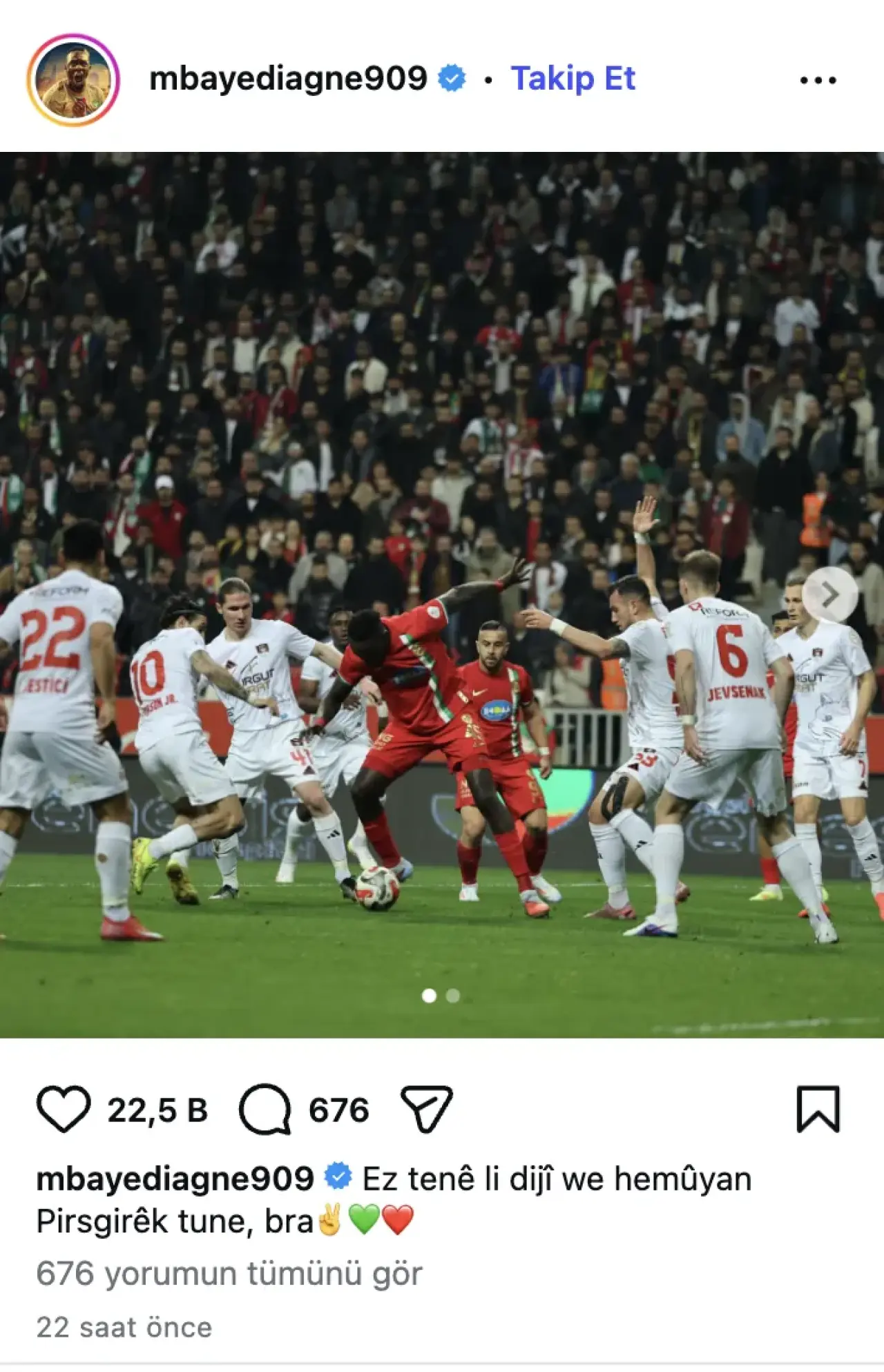Amedspor’un Vanspor karşısında aldığı galibiyetin ardından Mbaye Diagne’nin sosyal medya paylaşımı dikkat çekti. Golcü oyuncu, Kürtçe yayımladığı mesajla kısa sürede binlerce etkileşim aldı ve taraftarlar arasında gündem oldu.