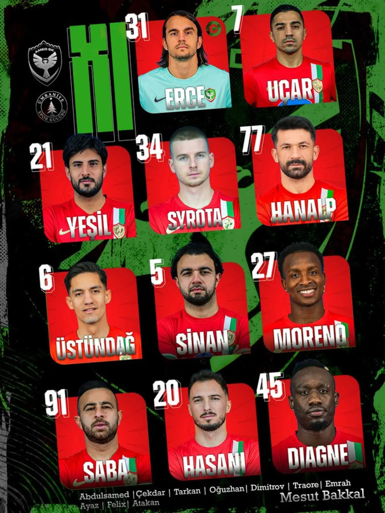 Erce, Murat Uçar, Mehmet Yeşil, Syrota, Celal, Cem, Sinan, Hasani, Dia Saba, Moreno, Diagne