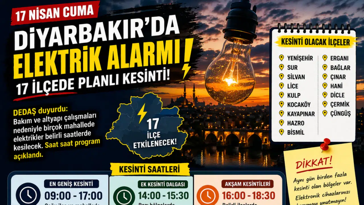 Diyarbakır’da 17 Nisan 2026 Cuma günü planlı bakım, onarım ve altyapı çalışmaları nedeniyle çok sayıda ilçede elektrik kesintisi yaşanacak. Dağıtım şirketi tarafından duyurulan program kapsamında başta Yenişehir, Sur, Silvan, Kayapınar, Ergani ve Dicle olmak üzere birçok bölgede enerji verilemeyecek.