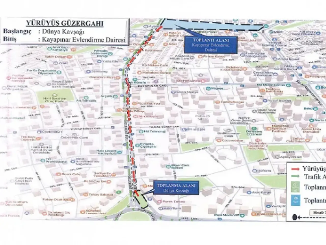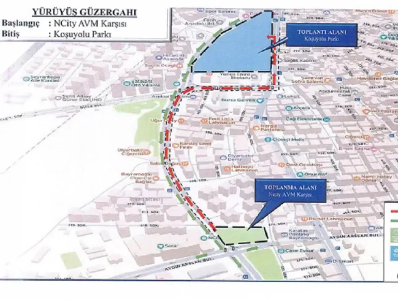 Katılımcılar buradan Turgut Özal Bulvarı üzerinden Sunay Caddesi’ni takip ederek yürüyüşü Koşuyolu Parkı’nda tamamlayacak.