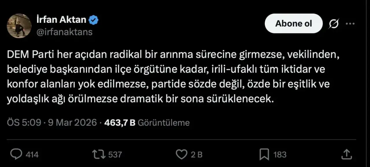 NuMedya24 ve JinNews'in ısrarlı takibi sonucu parti yönetimi Dilan Karaman sürecinde kamuoyu önünde özeleştiri vermek zorunda kaldı; ancak "sorumluları koruma" şüphesi tam olarak dağılmış değil. Gazeteci İrfan Aktan'ın dile getirdiği "mikro-iktidar alanları" uyarısı ise DEM Parti'nin kendi içindeki güç odaklarını tasfiye edip edemeyeceği sorusunu gündemin üst sıralarına taşıdı.